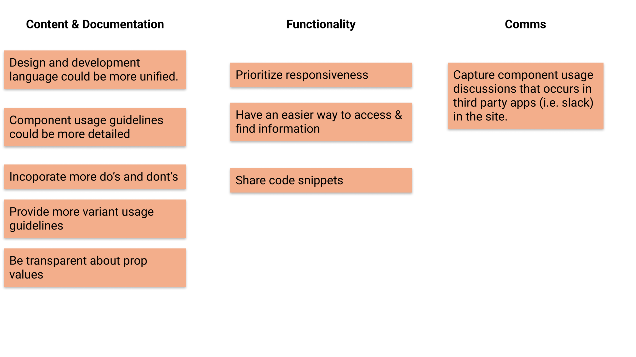 After receiving around 20 responses, we spent some time categorizing our responses to identify areas of opportunity and emerging themes.