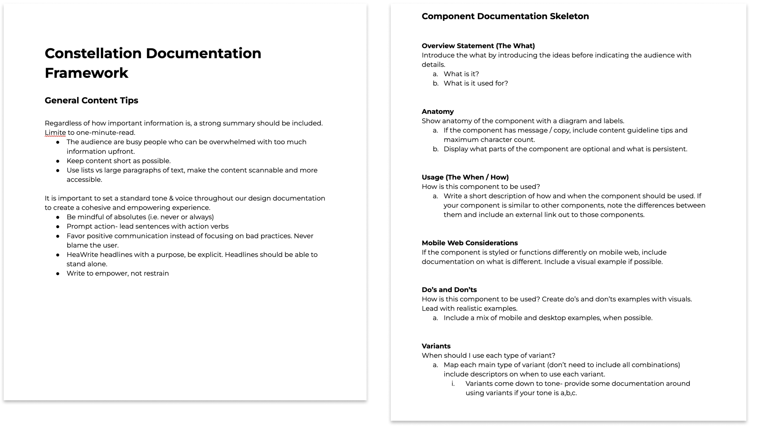 In this framework, we wanted to emphasize that less is more when it comes to writing effective design documentation. We wanted to encourage more showing vs. telling by incorporating sections for “do’s and don’ts” and “anatomy”.