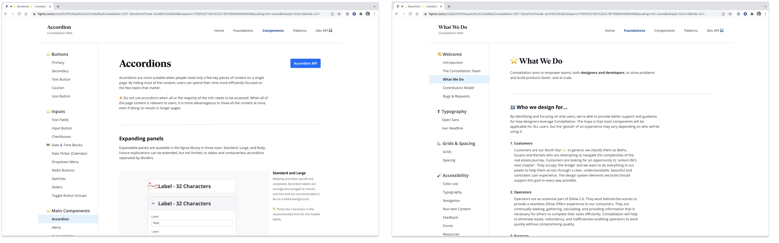 When I started Zillow in 2020, I was tasked with migrating our existing web design documentation content from Invision to Figma. I created a Figma prototype that hosted all our component documentation, which was named the “Constellation Storefront”. However, as more Constellation design partners used the Storefront, it became clear that the prototype lacked basic functionality and became more of a hinderance than a resource.